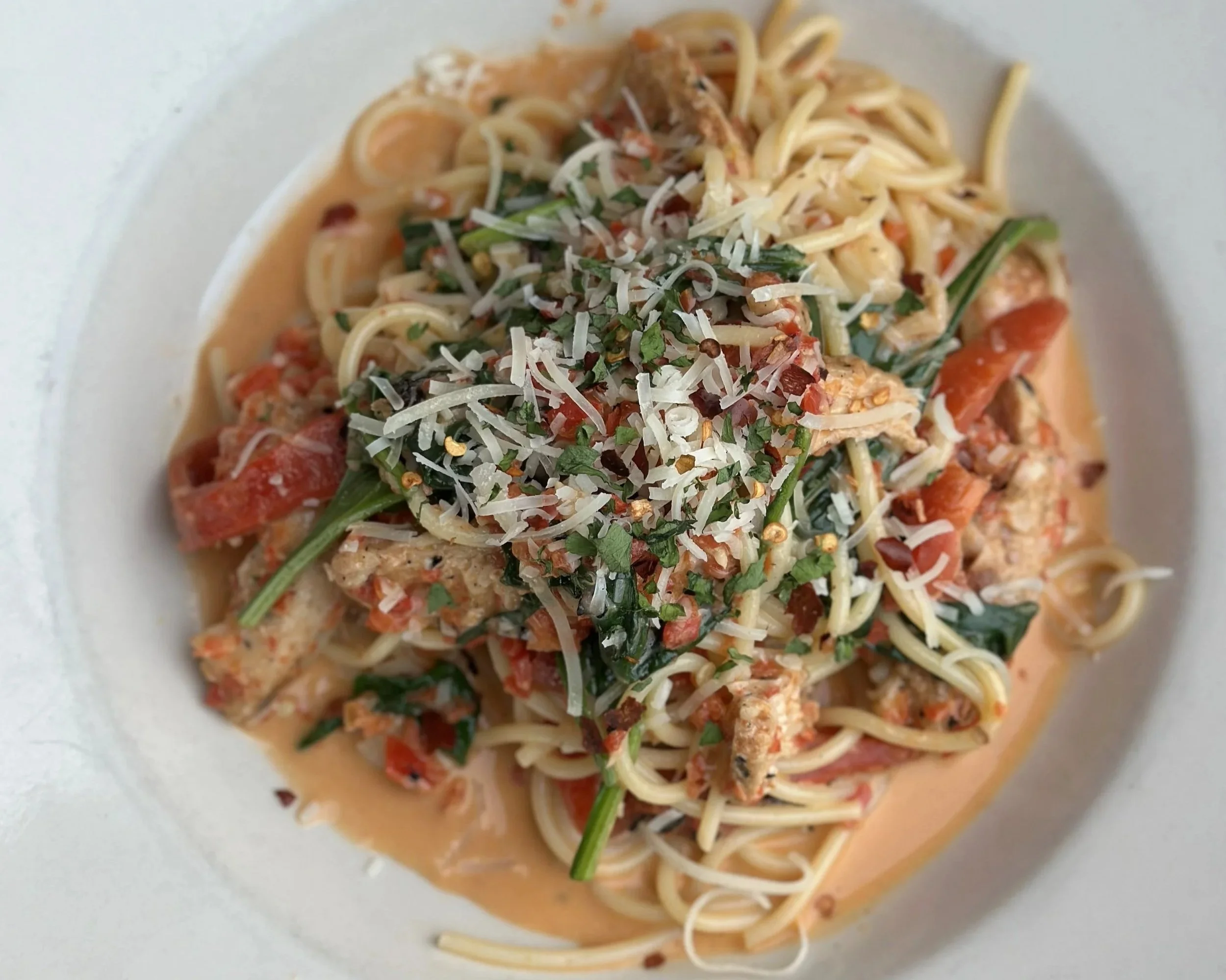Spaghetti spiraled like a haunted hedge maze, drenched in a roasted red pepper cream that glows like Room 237’s flickering light. Paprika-roasted chicken—tender, smoky, and slightly unhinged—lurks among blistered red pepper shards and sauteed spinach shadows. Unsettlingly delicious, disturbingly elegant, and impossible to escape.