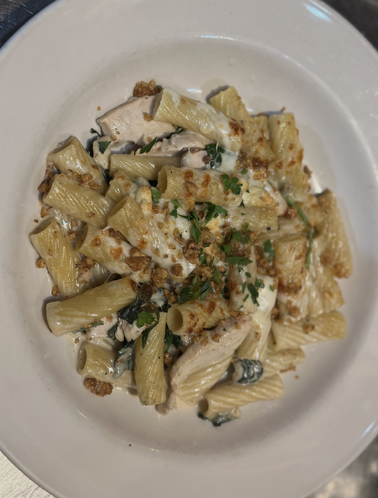 Baked rigatoni in a creamy chicken broth and gorgonzola sauce with fresh spinach, finished in the oven until bubbly. Topped with toasted walnuts, crumbled gorgonzola, and fresh parsley.