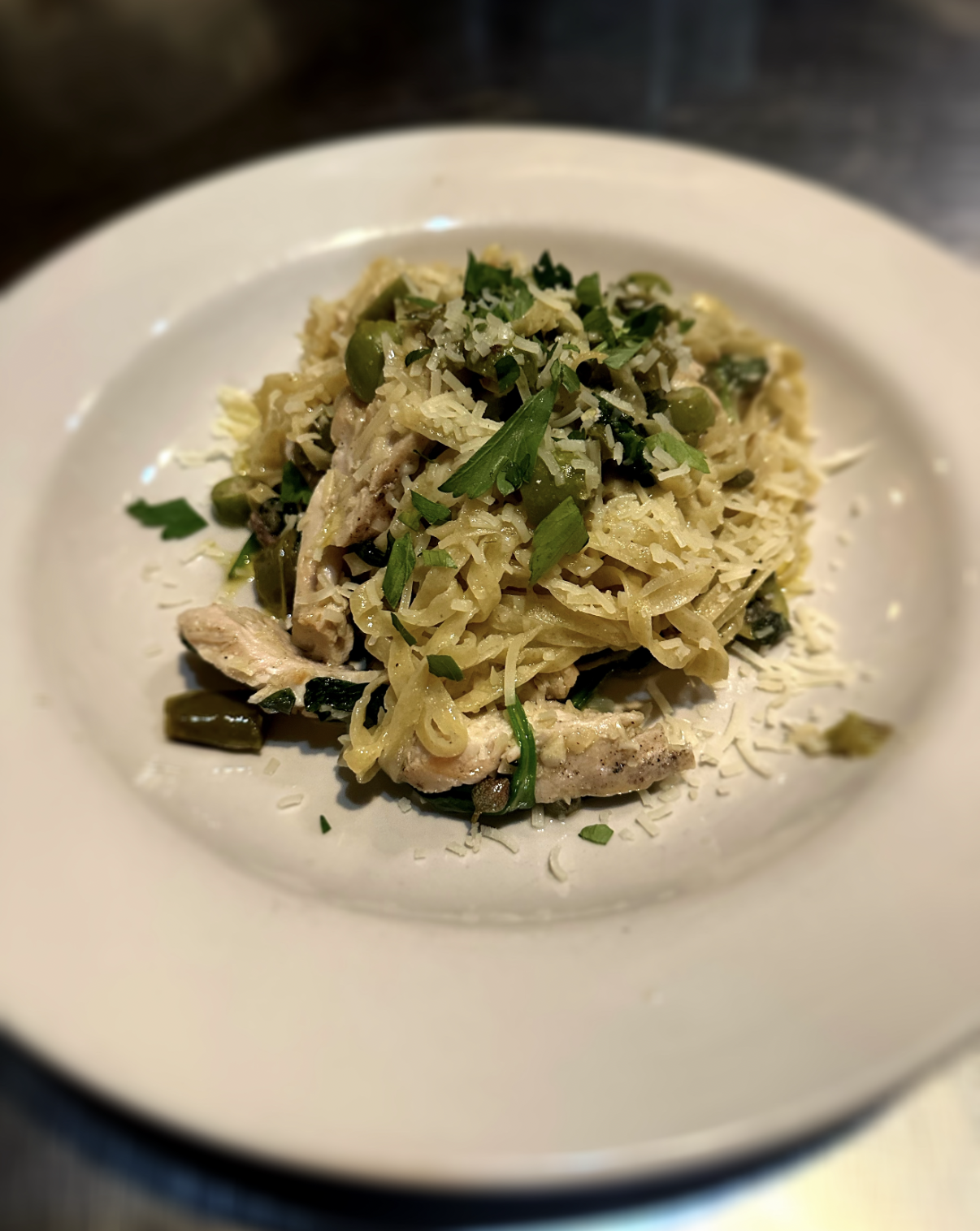 House-made linguini with chicken, green olives, capers, anchovies, jalapenos and spinach.