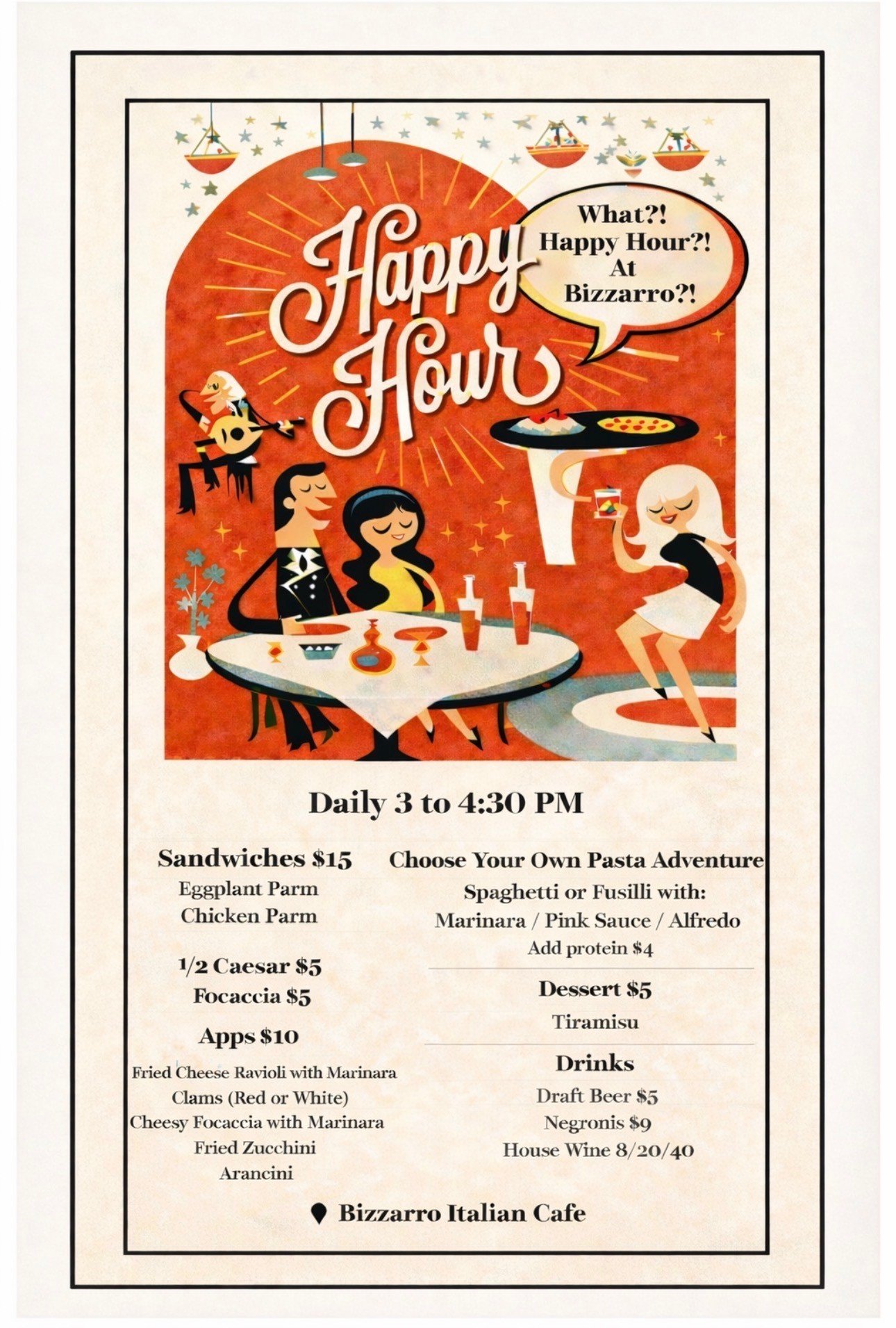 Bizzarro is a cozy, intimate restaurant with just one table that can accommodate a party of eight. Unfortunately, we can’t host larger groups and we share your wish for more space.