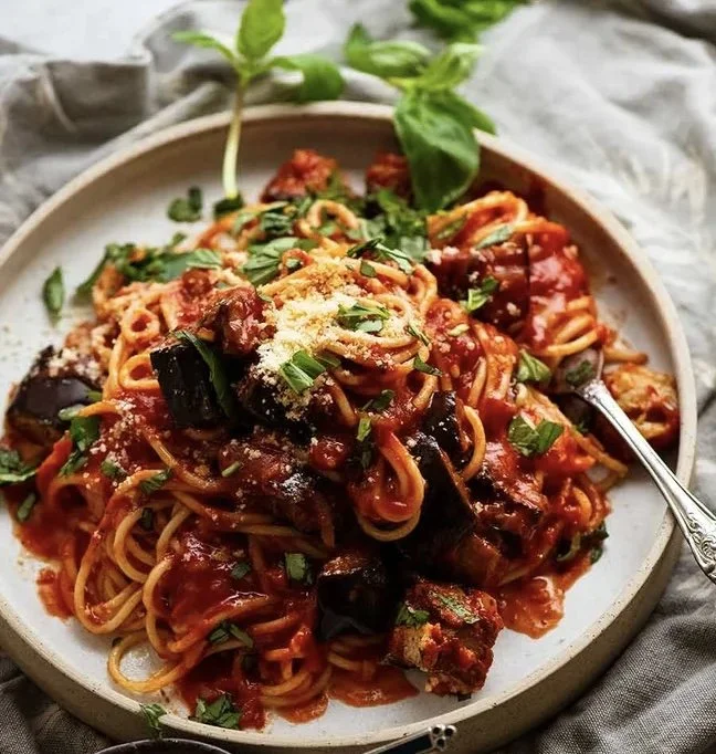 Spaghetti Rustica tossed in our world famous marinara, loaded with tender eggplant, garlic, grilled chicken, fresh basil and a touch of chili flakes. Finished with Parmesan and fresh parsley.