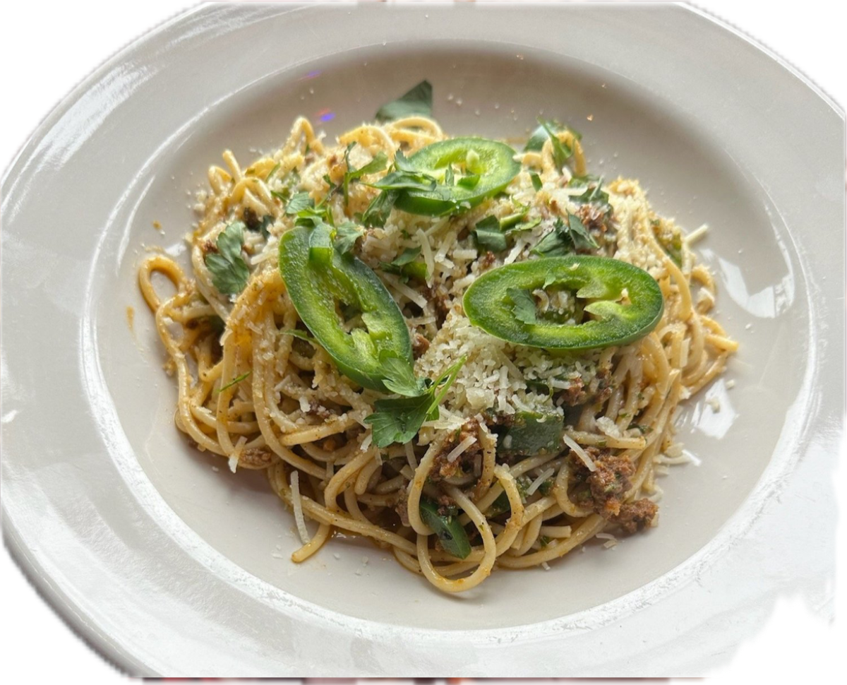 Roasted jalapeno peppers, garlic, parmesan and walnuts pounded together into a spicy pesto. This fiery sauce is tossed with spaghetti pasta and chorizo sausage. Finished with even more parmesan and jalapenos.